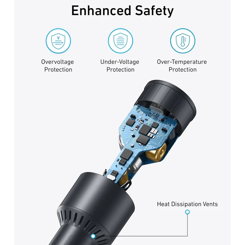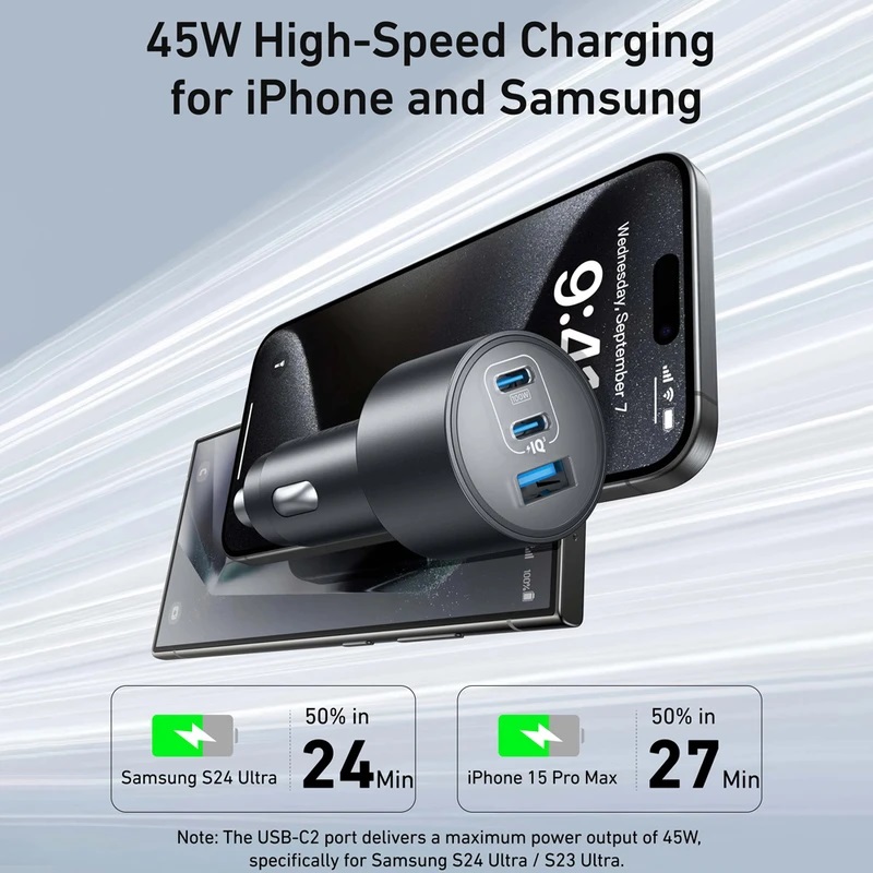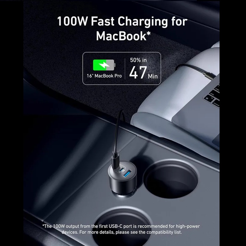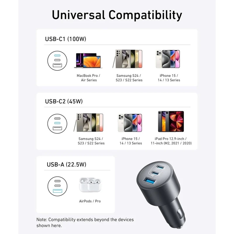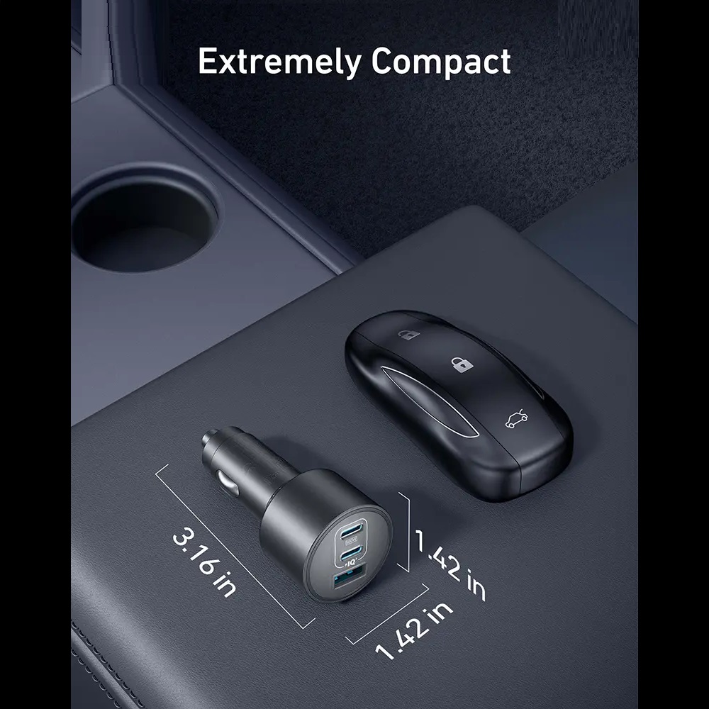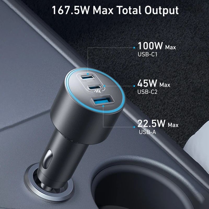 سه درگاه ۱۶۷.۵ وات حداکثر: همه دستگاههای ضروری خود را با اولین پورت USB-C که ۱۰۰ وات قدرتمند، دومین پورت USB-C 45 وات و پورت USB-A 22.5 وات اضافی اضافه میکند، بهطور یکپارچه به برق رسانی کنید.پورت فوق سریع ۱۰۰ واتی USB-C1: با اولین درگاه USB-C با ۱۰۰ وات، مک بوک پرو ۱۶ اینچی خود را تنها در ۴۷ دقیقه به سرعت از ۰ تا ۵۰ درصد شارژ کنید.پورت قابل اطمینان ۴۵ واتی USB-C2: دومین درگاه USB-C حداکثر توان ۴۵ وات را ارائه میکند و شارژ سریع و مطمئن را برای آیفونها و دستگاههای سامسونگ فراهم میکند و شما را بدون هیچ تأخیری متصل نگه میدارد.کوچک و توانا: این شارژر فوق العاده جمع و جور طراحی شده که محجوب باشد، فضای داخلی خودروی شما را شلوغ نمی کند.